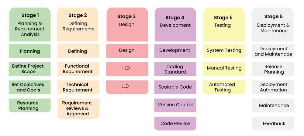 چرخه عمر توسعه نرمافزار یا SDLC از چند مرحله مهم تشکیل شده است که هر یک نقش کلیدی در تولید یک نرمافزار پایدار، قابلاعتماد و کارآمد دارند. در ادامه، این مراحل را بهصورت دقیق و قابلفهم مرور میکنیم.